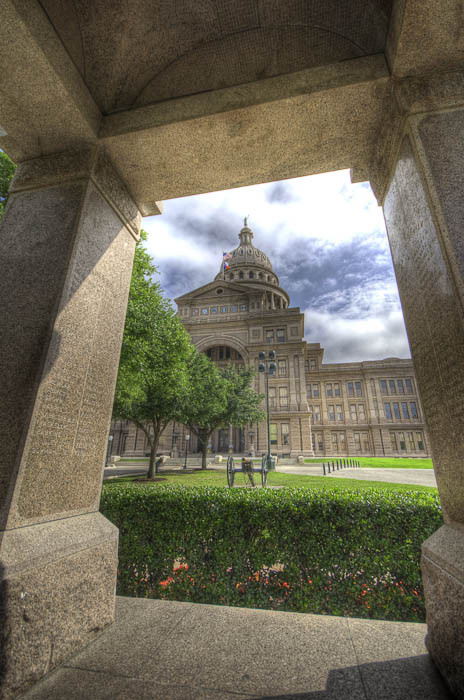 Here’s one from the archives which I’ve had queued up for about a year but left to post on a rainy day. This is the Texas State Capitol (as if you hadn’t figured that out already) shot through the Heroes of the Alamo Memorial. This monument has the rather embarrassing distinction of having about half its inscribed names spelled wrongly. It also has 47 names on it which don’t actually appear to relate to people who fought at the Alamo. So much for fact-checking.