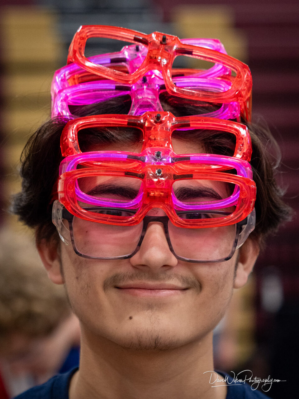 A robotics team member sporting rather too many pairs of glasses at the FIRST in Texas Dripping Springs district event at Dripping Springs High School, April 4th, 2026.