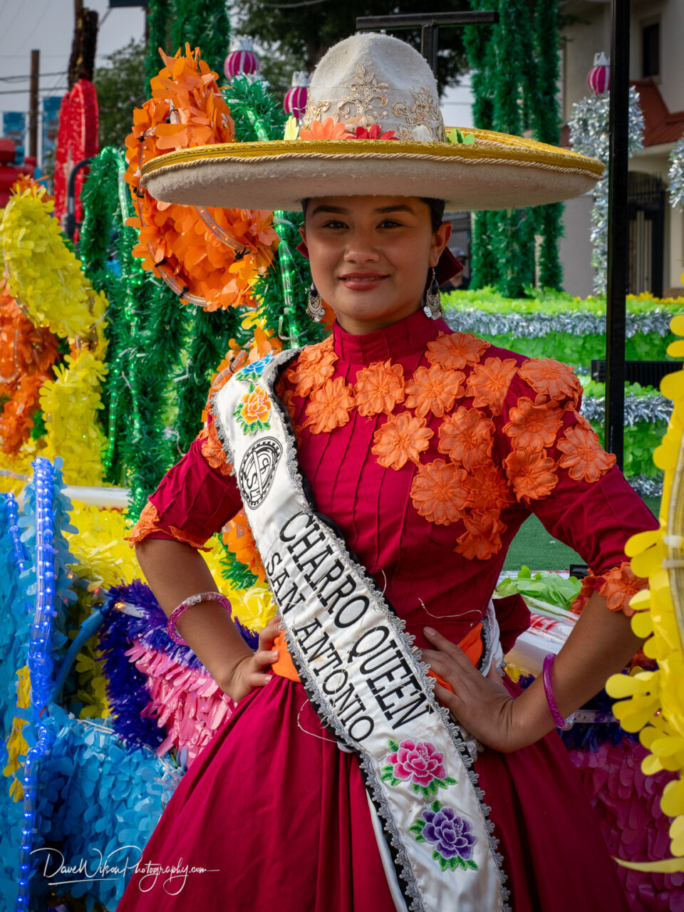 Arlet Landero, 2026 Fiesta Charro Queen, stands in front of her float before the start of the Fiesta Flambeau Parade in San Antonio, Texas on April 25th, 2026. Charro Queen is one of the 9 official Fiesta Royalty positions and is supported by the Asociacion de Charros de San Antonio. Arlet is an accomplished horsewoman who competes in escaramuza and women’s bull riding in competitions around the US and Mexico.