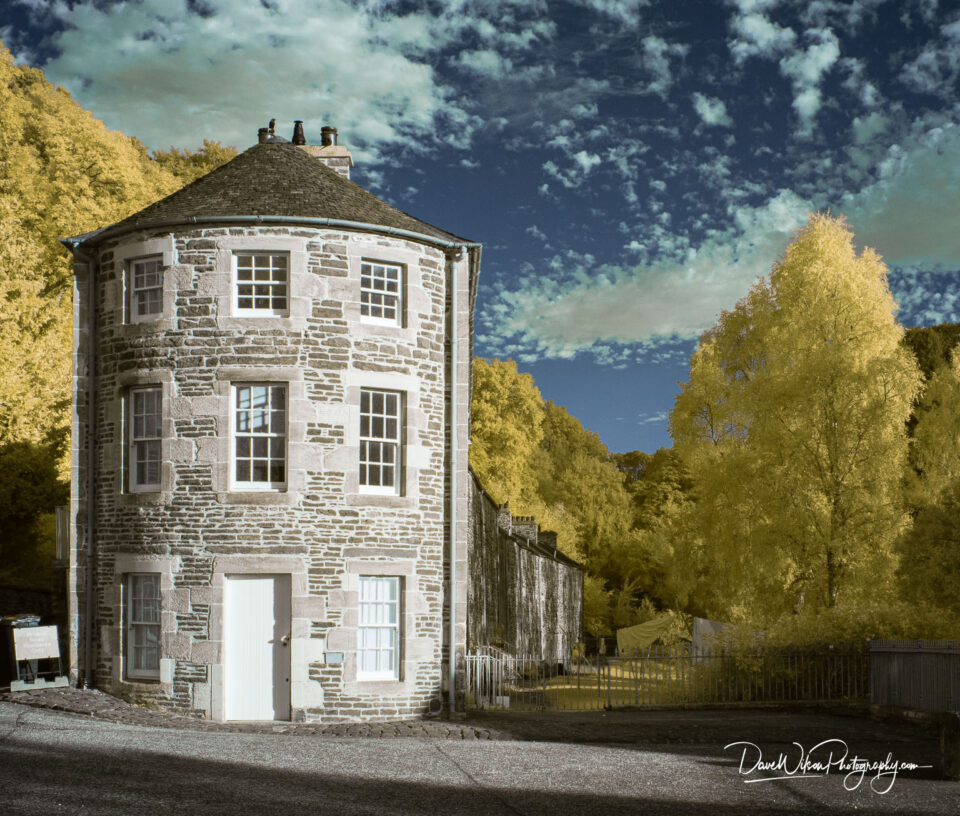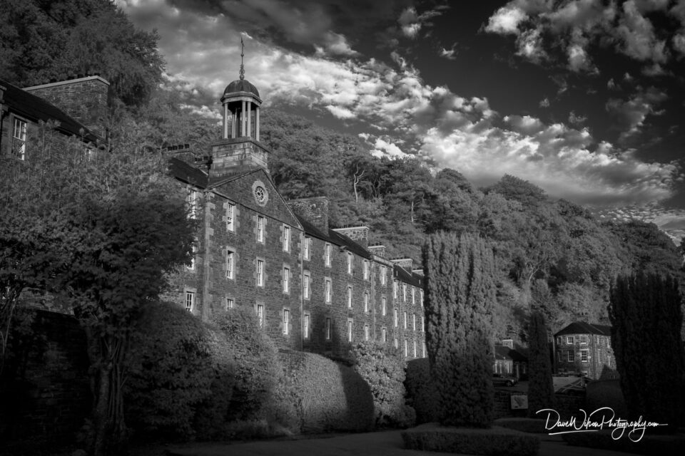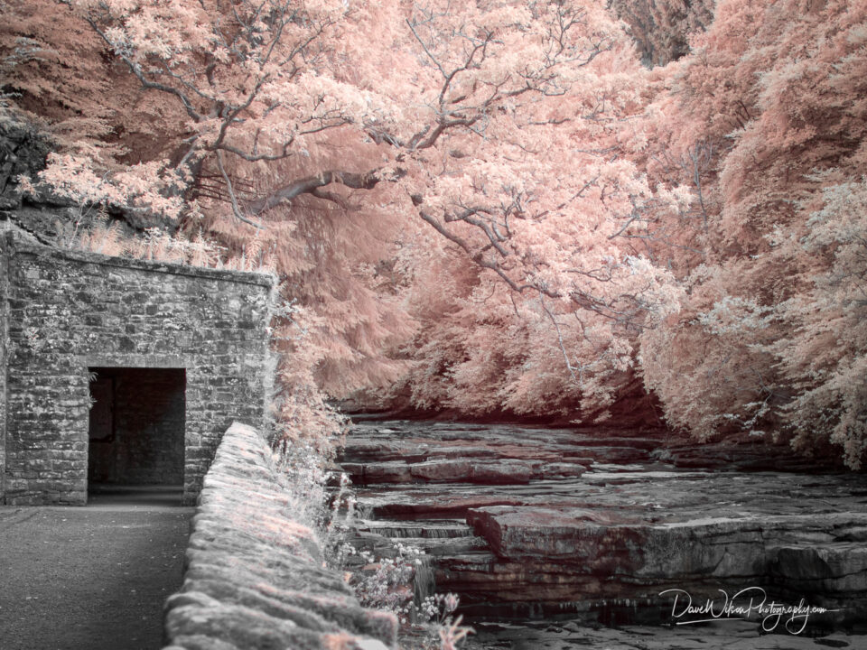 An infra-red image of a rather dry Dundaff Linn at New Lanark, Scotland. This is the third, and smallest of the waterfalls forming the Falls of Clyde....
