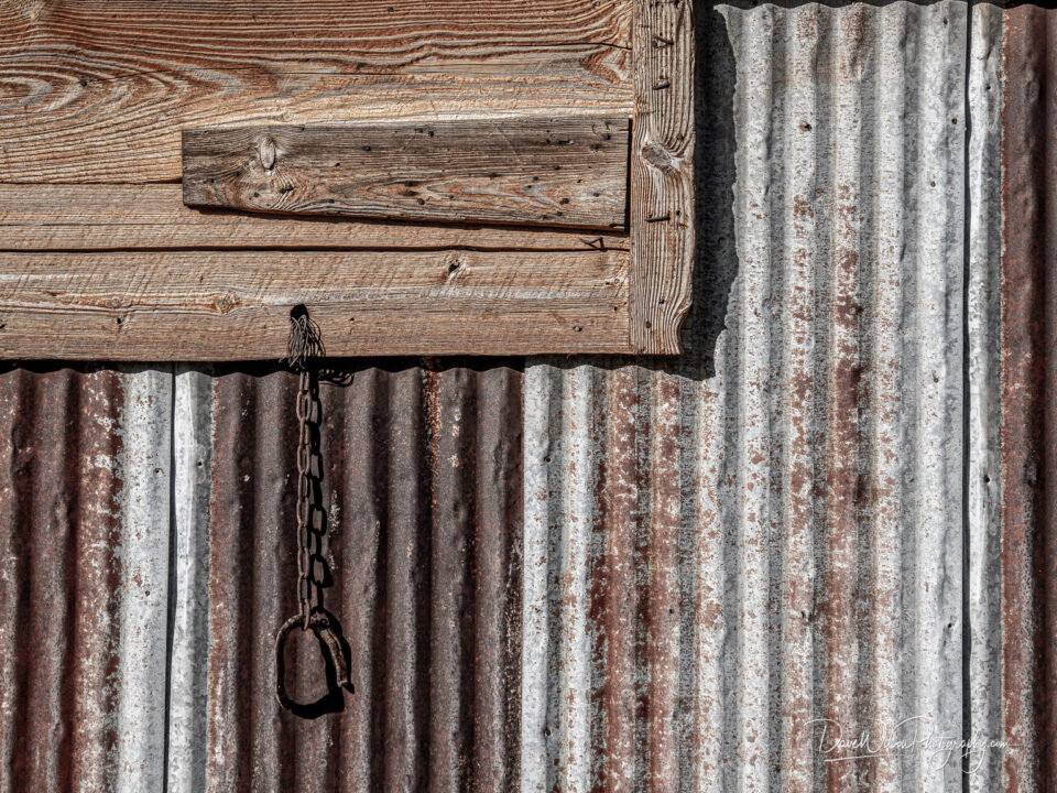 Rust and wood grain textures on the side of a cabin at Barons Creekside in Fredericksburg, Texas, March 23rd, 2026.