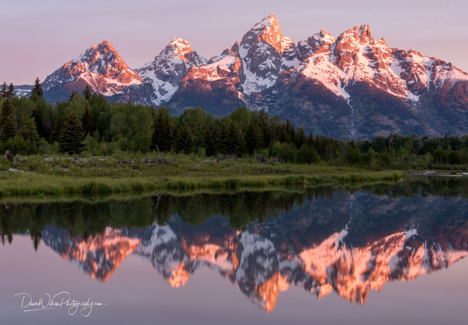 Mountains in Grand Teton National Park, Wyoming, reflected in the water at Schwabacher Landing shortly after sunrise on the morning of June 7th, 2016.