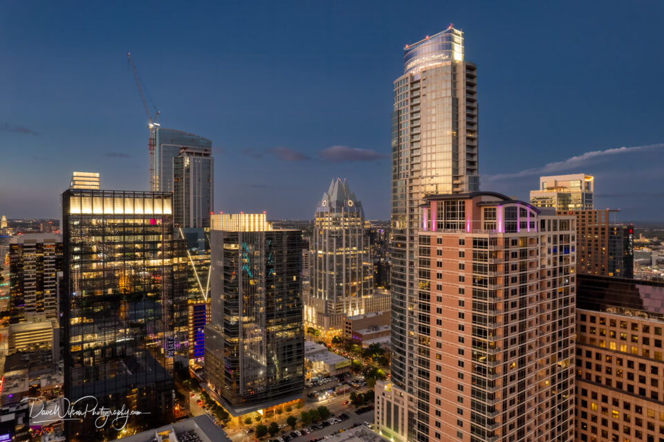 An aerial image of a section of downtown Austin, Texas showing various buildings including the Frost Band Tower (center) and Austonian (center right) taken...