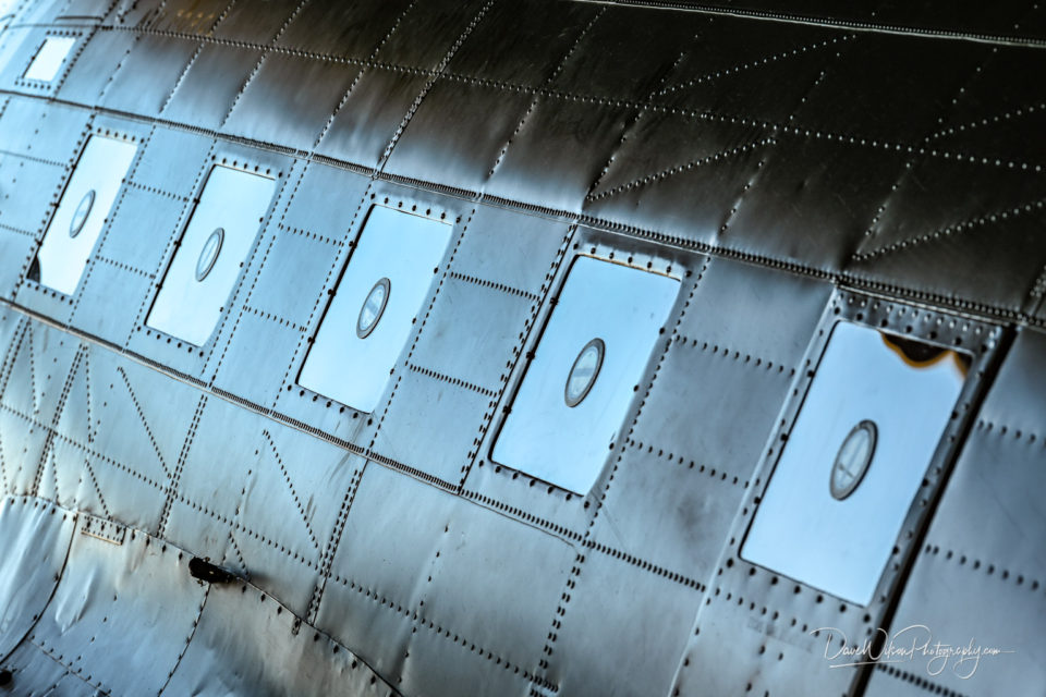 A detail of the fuselage and windows of C-47 Skytrain “That’s All Brother” from the Commemorative Air Force in San Marcos, Texas. This...